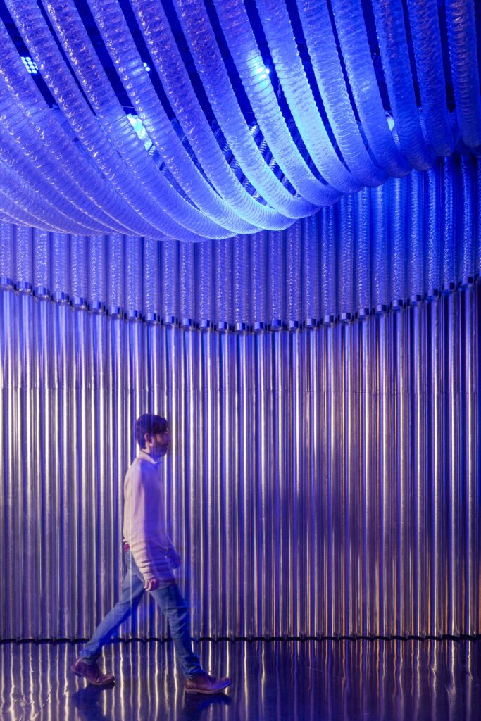 En este proyecto mezclamos la fabricación digital parametrizada, con la mano de obra artística, para dar vida a esta “ballena” conformada por 80 ductos translúcidos de 4″, de los cuáles 10 contenían luminarias en sus puntas.